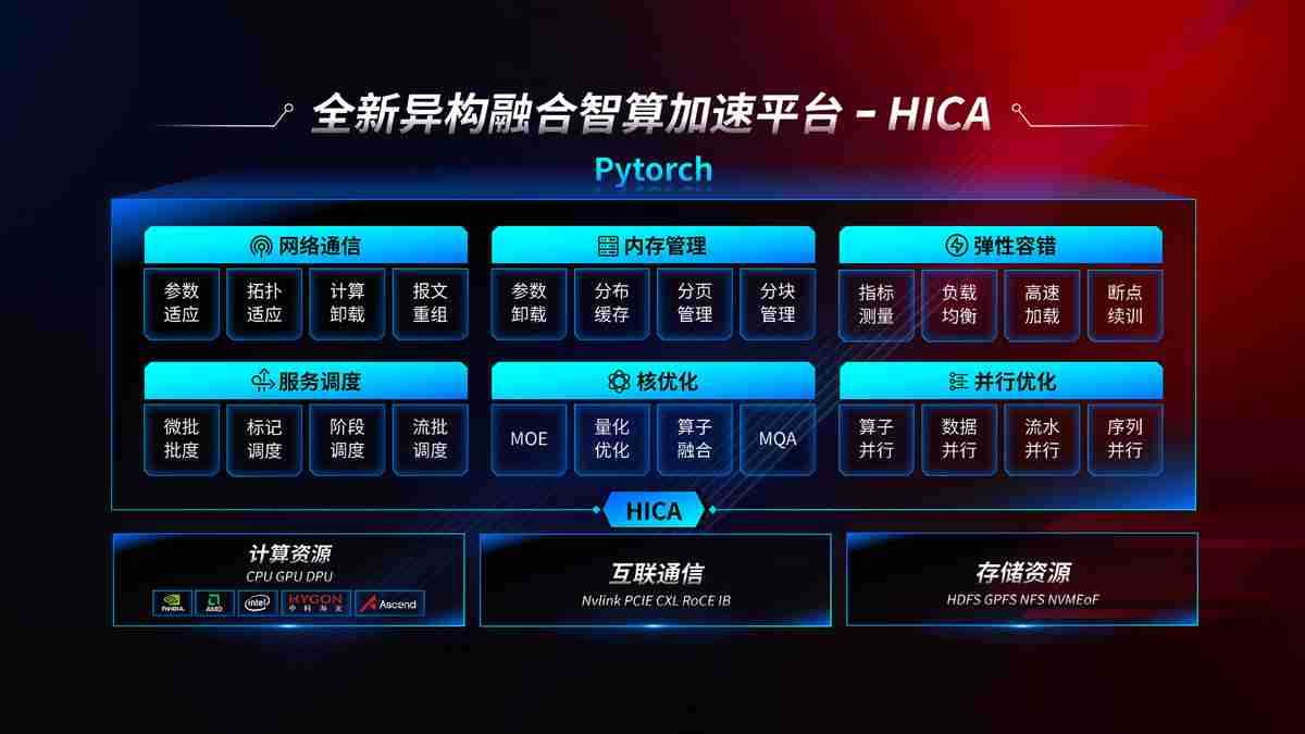 通过自研的服务层、、、中间适配层、、以及调度编排算法,,,采用数据并行、、、模型并行等多种并行方式,,把并行计算任务进行有效的分解,,,使其分别由相应的软件栈和算力资源来承接。。。。当GPU资源变化,,HICA可以实时动态调度计算子任务并调整模型拓扑和架构,,,,以充分聚合各种算力资源。。。