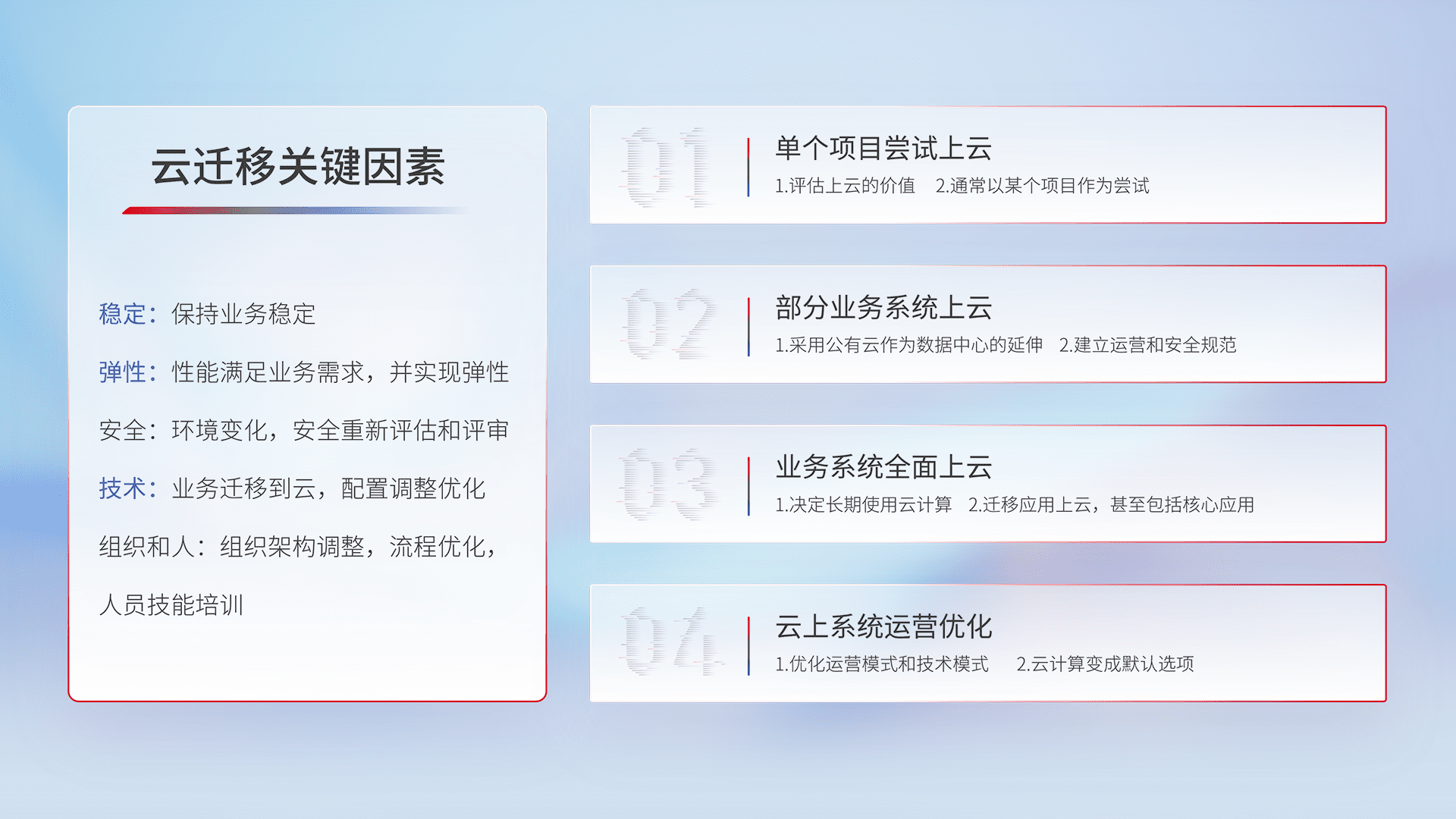 结合实际业务,,,,从规划设计、、、、云平台选型、、、云原生改造、、数据迁移、、、集成交付,,,迁移全过程为客户识别最佳上云路径,,,做好风险识别管理,,设计网络架构、、、身份权限、、、、安全审计合规、、操作审计、、日志审计、、、监控告警策略、、、多站点容灾设计等,,,,对云上基础设施进行整体规划,,,提升IT治理水平,,以满足弹性、、、高可用、、、高性能的需求。。。