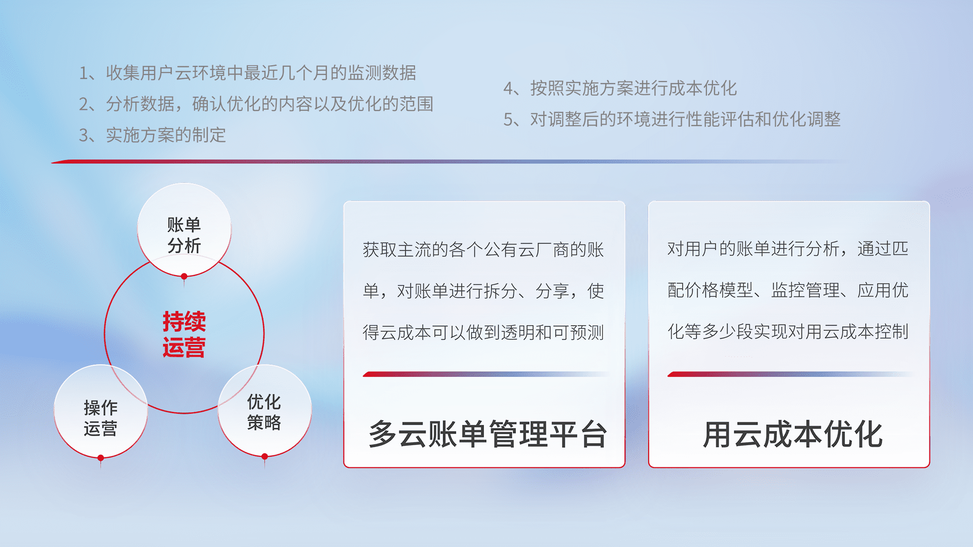 通过多云纳管,,以统一的资源数据模型把客户的云资源进行抽象和封装,,,进而实现对多云资源的统一操作,,,保障云资源管理的可靠性、、、、稳定性与可用性。。量身定制化运维内容,,,配置、、开发运维、、、补丁管理、、备份、、、、监控、、认证和访问管理、、、、审计和日常巡检等,,保障在用云过程中的可靠度,,,,稳定度以及高可用率。。